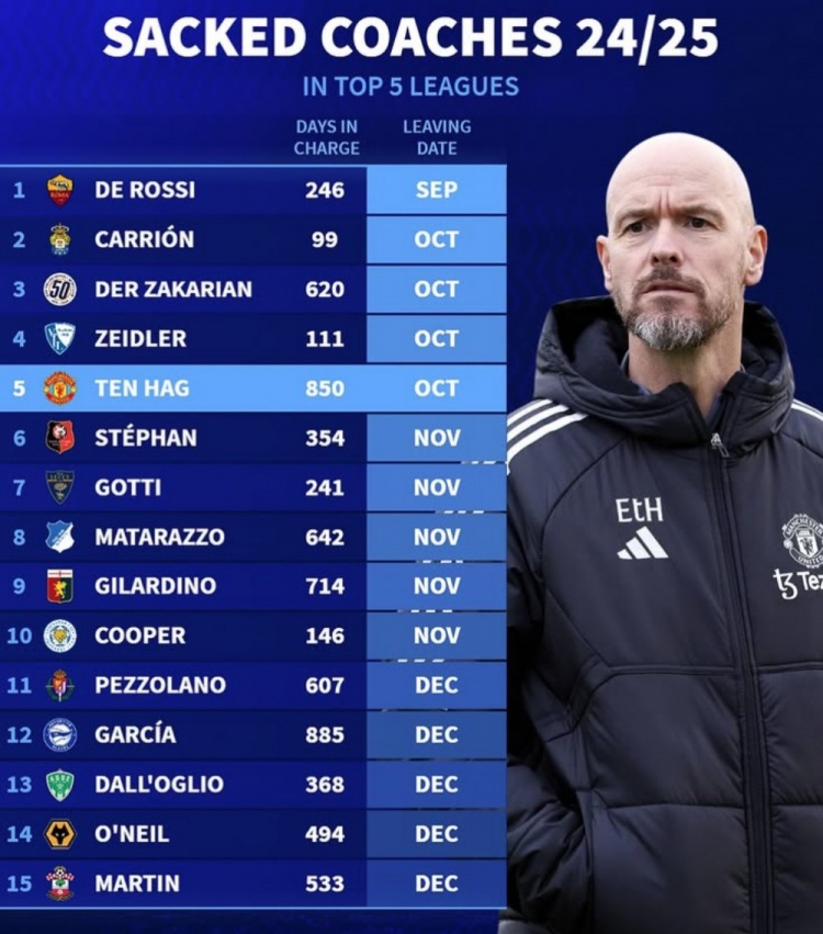9月份,羅馬的德羅西下課,執教時間為246天。緊接著在10月,拉斯帕爾馬斯的卡裏翁與蒙彼利埃的紮卡裏安分別在執教99天和620天後離開了各自的位置。同時,波鴻的蔡德勒在111天的任期後也被解雇,而曼聯的滕哈赫則是在850天後遭遇下課,反映出在高壓環境下球隊對主帥的容忍度和期望值存在差異。