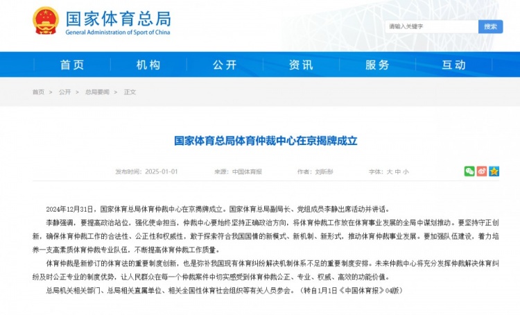 中國體育仲裁委員會近日宣布,在2024年12月31日於北京舉行了體育仲裁中心的揭牌儀式,該中心將負責委員會的日常事務管理。國家體育總局副局長李靜出席了這一儀式並發表講話。