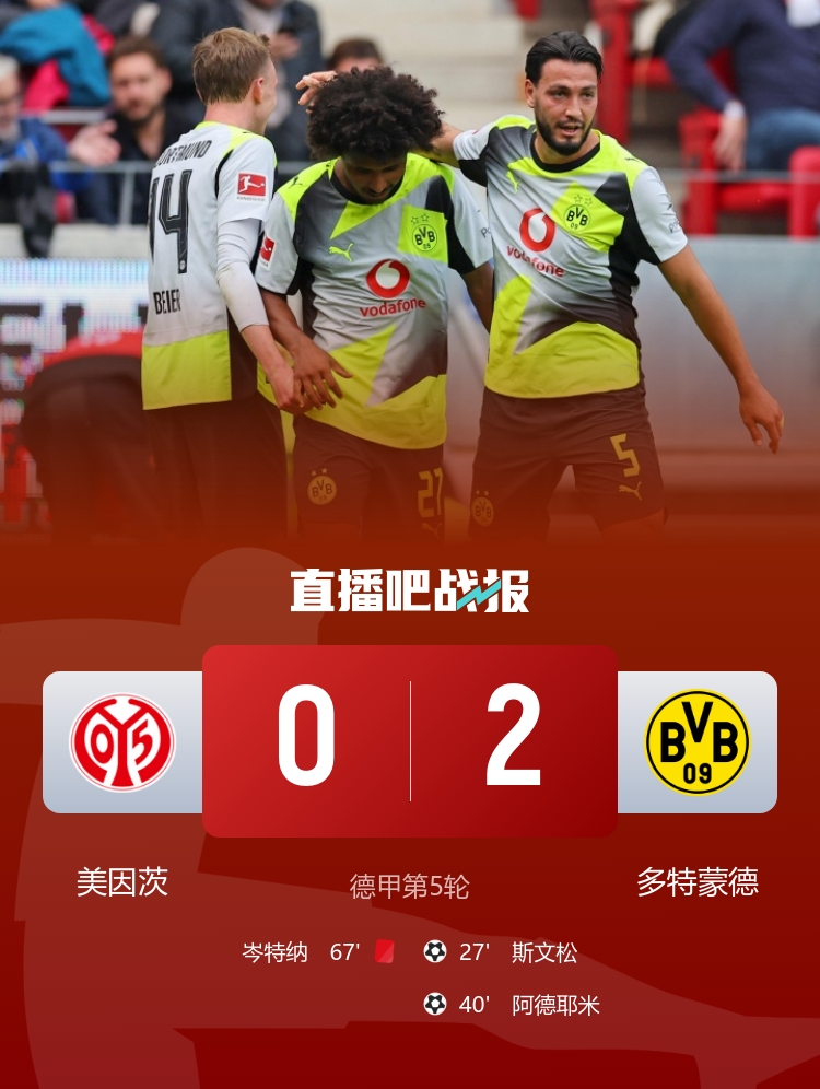 多特輕松應對十人美因茨 阿德耶米終於找到感覺 布蘭特成兩大助攻制造機
