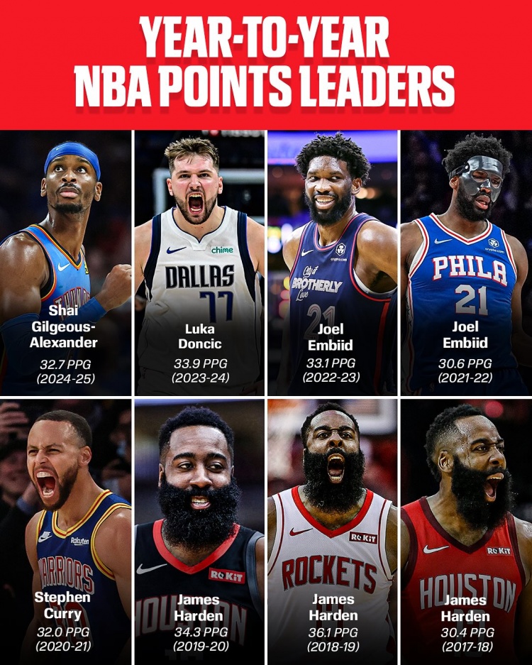 從2024-25賽季開始,亞歷山大以場均32.7分的表現嶄露頭角,展現了他在進攻端的高效率和領導能力。更早的2023-24賽季,東契奇以33.9分奪得得分王,他的全能進攻能力和強大的籃板能力使他成為對手防守的噩夢。