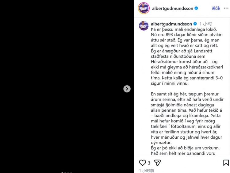 12月5日,佛羅倫薩前鋒阿爾伯特·古德蒙德森在性侵案中再度被判無罪,他通過社交媒體表達了自己的感受。他提到,自事件發生以來已經過去了893天,他深切回憶起過去的每一個瞬間,也明白什麼才是真正的真相與正義。古德蒙德森對最高法院確認地方法院的判決表示欣慰,稱這是一場自己職業生涯中的重要勝利,仿佛是以3比0力克對手一樣的痛快。