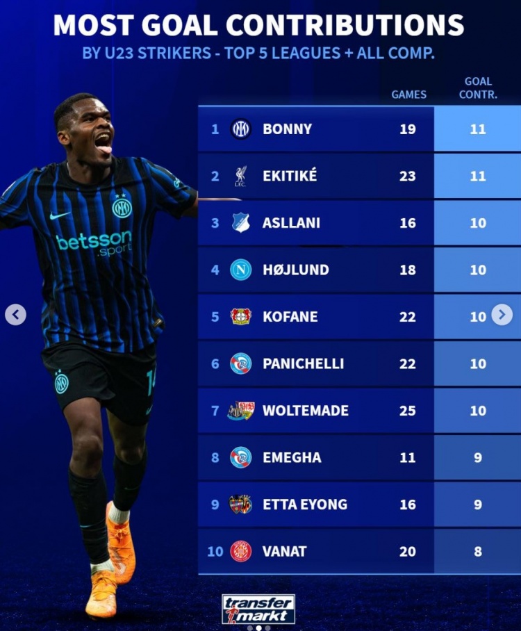 根據《轉會市場》的最新統計,本賽季五大聯賽的U23前鋒們在各項賽事中的表現相當驚艷。特別值得一提的是,國米的博尼和利物浦的埃基蒂克,兩位年輕球員都以各自的11個進球高居榜首,展現出他們在進攻端的無限潛力。