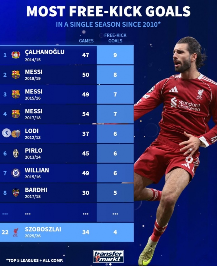 在英超的最新一輪比賽中,利物浦在主場以1-2不敵曼城。此役中,索博斯洛伊為球隊打入了一粒直接任意球,這也是他本賽季的第四個任意球進球。根據數據統計,他在2010年後五大聯賽單賽季各項賽事任意球進球榜中,已經升至第22位。